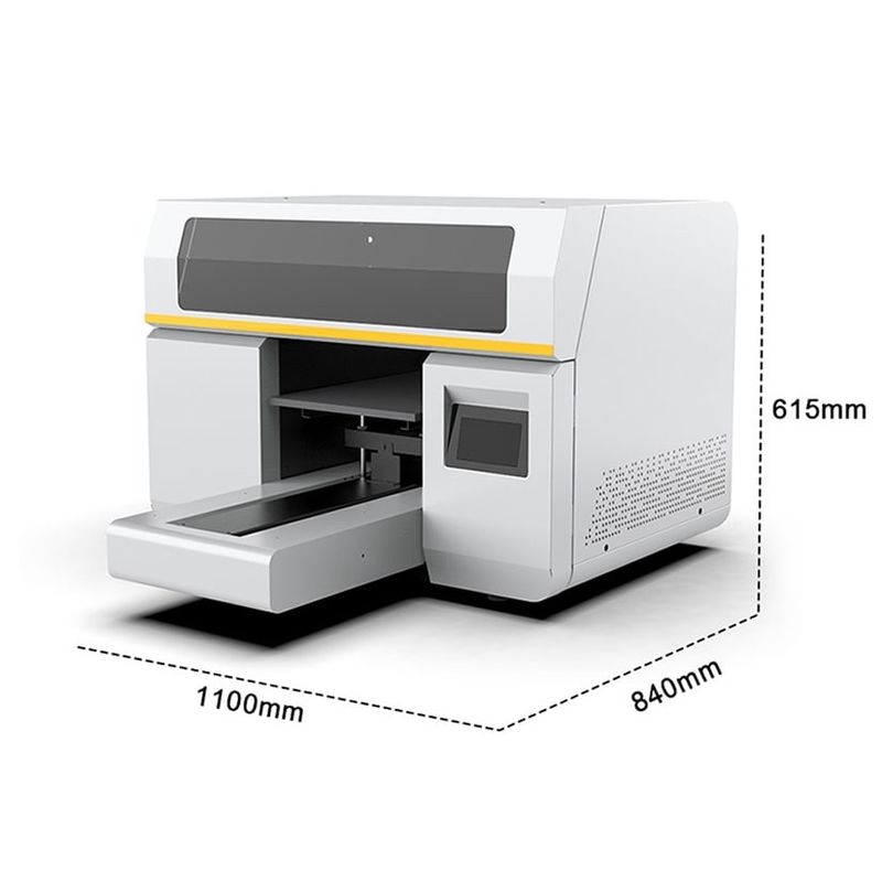 Printer ini memiliki desain kompak dengan dimensi 1100x840x615mm, menjadikannya printer flatbed A3 UV yang ideal bagi mereka yang ingin menghemat ruang.Printer ini sangat cocok untuk mencetak pada berbagai bahan termasuk kayu, kaca, dan logam.